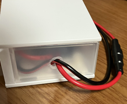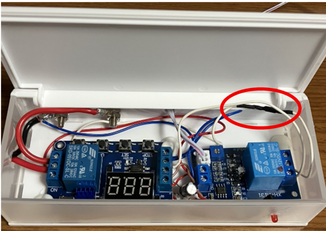 結線が終わったら、このようにケースに収めました。赤丸の中の黒い部分は、ダイオードです。光モジュールのリレーは