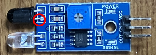 赤外線センサーとIRセンサーを取り外した後、赤丸に1本リード線を取り付けます。