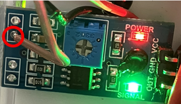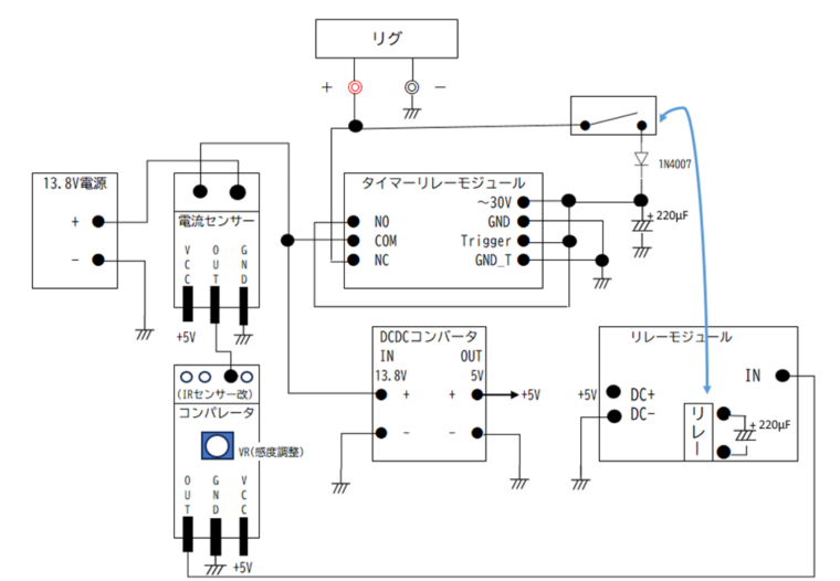 13.8Vの電源は、電流センサーの赤丸の端子に接続してください。反対にすると検知しません。