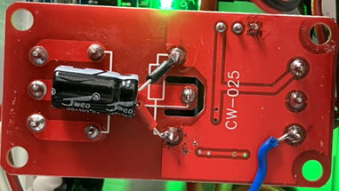 改造と言っても、バタつき防止のために220μFの電解コンデンサを1個取り付けるだけです。私は基盤に